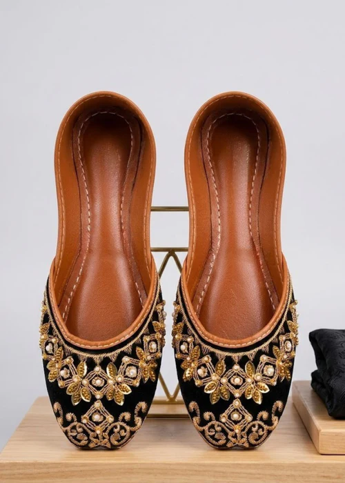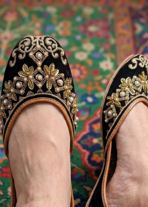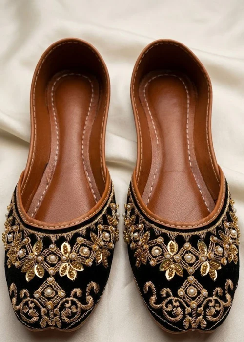 Elevate your style with these sophisticated black velvet Khussa shoes by Surmeen. Featuring a durable rubber sole, these sleek and comfortable shoes are perfect for all-day wear. Step out in trendsetting elegance with these versatile and stylish footwear. Ideal for formal occasions or adding a touch of luxury to your everyday wardrobe.