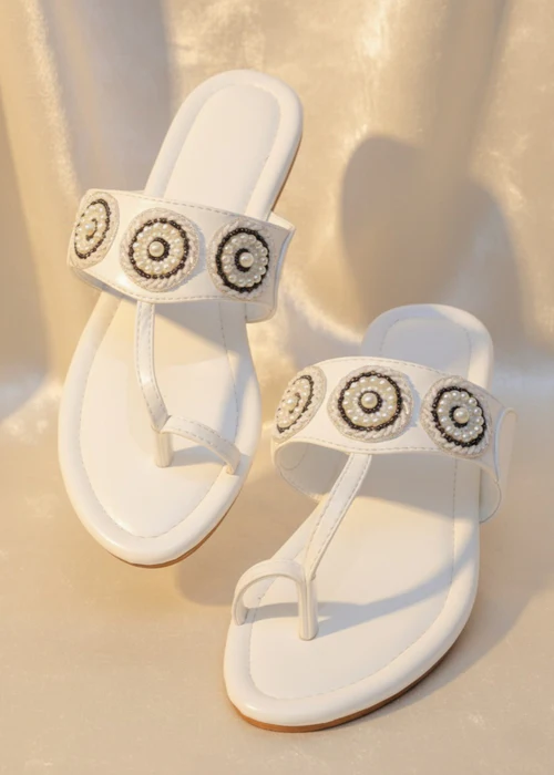 Step into timeless grace with our Pearl Elegance Kolapuri, crafted in pristine white for a sophisticated and versatile look. The broad strap is adorned with delicate hand-embellished circular motifs featuring pearl and bead detailing, adding a touch of luxury and charm. Designed with comfort in mind, these kolapuris feature a soft sole and classic toe-loop style for all-day ease. Perfect for festive occasions, summer outings, or elevating your everyday ethnic wear.