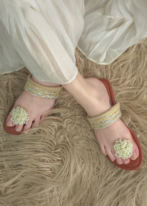 Jasmine – a beautifully handcrafted pair featuring a jute upper and delicate pearl embellishments. Perfect for both casual and festive looks, this lightweight and breathable flat offers style and comfort in every step. Disclaimer: Actual product color and material may vary slightly from the image.